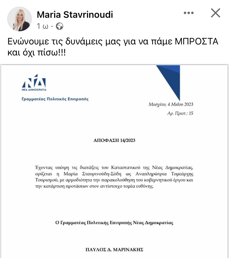 ΝΔ: Τομεάρχης τουρισμού η Μαρία Σταυρινούδη Σόδη. Σε ανάρτηση της αναφέρει: