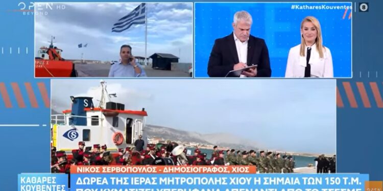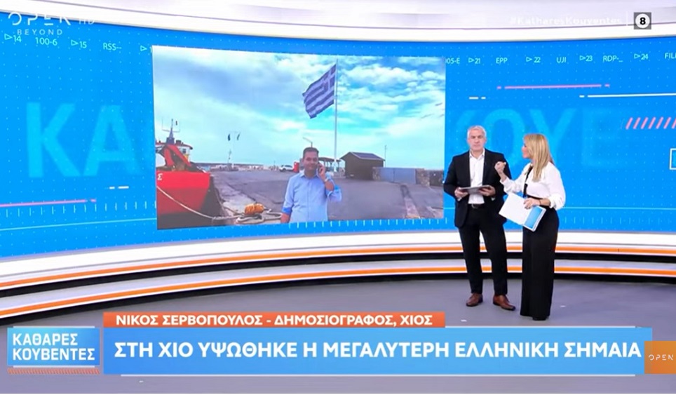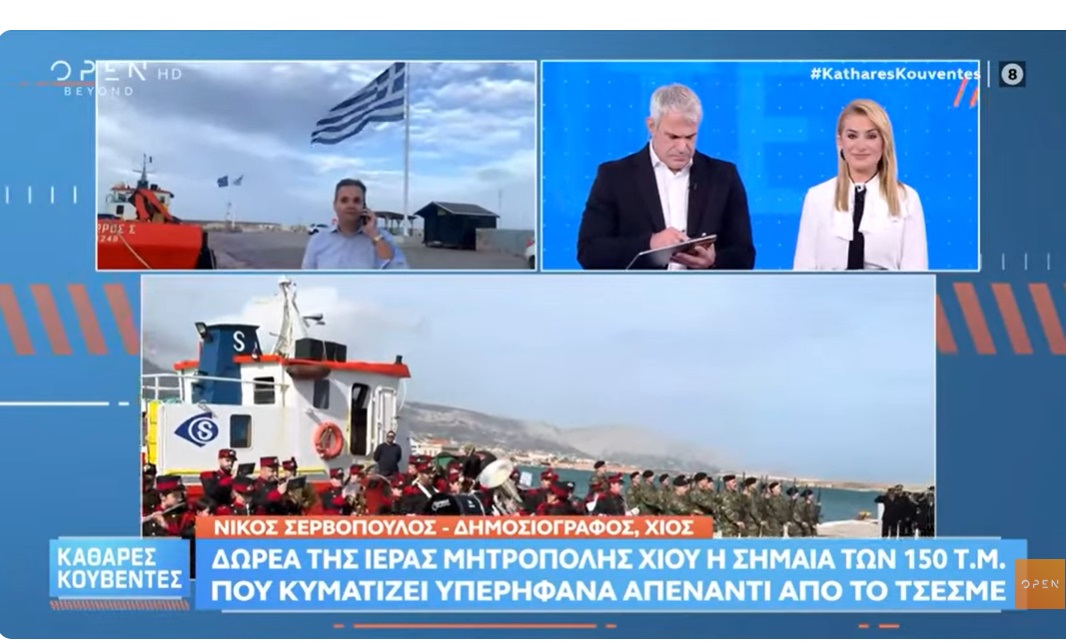 Η έπαρση της σημαίας πραγματοποιήθηκε στο λιμάνι της Χίου στις 12:00 το μεσημέρι της Δευτέρας, παραμονή της 28ης Οκτωβρίου, παρουσία πλήθους κόσμου και εκπροσώπων των τοπικών Αρχών. Στο ρεπορτάζ από την σημαία στην εκπομπή Καθαρές κουβέντες του OPEN με την Αλεξάνδρα Χατζηγεωργίου και τον Σπύρο Χαριτάτο σε σύνδεση με τον Νίκο Ζερβόπουλο ο παρουσιαστής τόνισε χαρακτηριστικά: Δεν υπάρχει η 28η στη Χίο- Να περπατάς στα σοκάκια, να επισκέπτεσαι τα μουσεία, κατανυκτική ατμόσφαιρα. Δείτε το ρεπορτάζ: