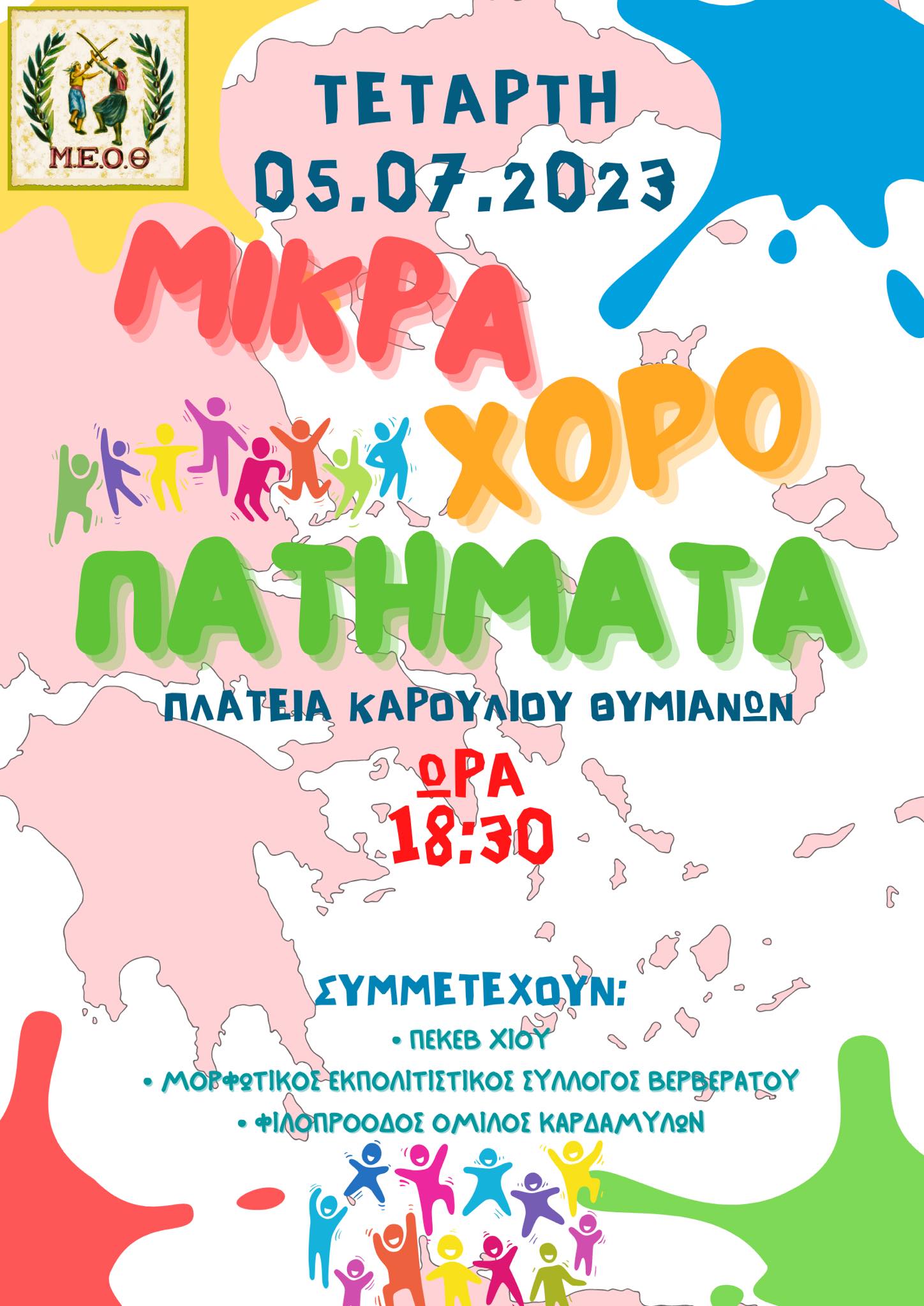 Ο Μορφωτικός Εκπολιτιστικός Όμιλος Θυμιανών σας προσκαλεί την Τετάρτη 5 Ιουλίου, στις 18.30, στην πλατεία Καρουλίου Θυμιανών να συνοδέψετε τα τμήματα παραδοσιακού χορού (junior, παιδικά, εφηβικό και ενηλίκων) στα μικρά τους χοροπατήματα με χορούς απ’όλη την Ελλάδα. Αντάμα με τα παιδικά τμήματα του Μορφωτικού Εκπολιτιστικού Συλλόγου Βερβεράτου, της ΠΕΚΕΒ και του Φιλοπρόοδου Ομίλου Καρδαμύλων θα γεμίσουμε την πλατεία με ρυθμό, παραδοσιακό χορό , χαμόγελο και ανεμελιά δίνοντας τόπο στα νιάτα και ευκαιρία στους μικρούς χορευτές και χορεύτριες να ξεδιπλώσουν το ταλέντο τους !