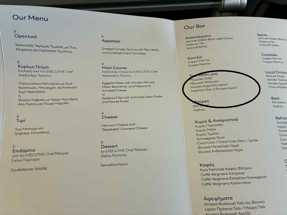 Η Μαστίχα Χίου, τοπικό ποτό στο μενού της Aegean Airlines Bussines Class για τα ταξίδια στο εξωτερικό. Δείτε το μενού: