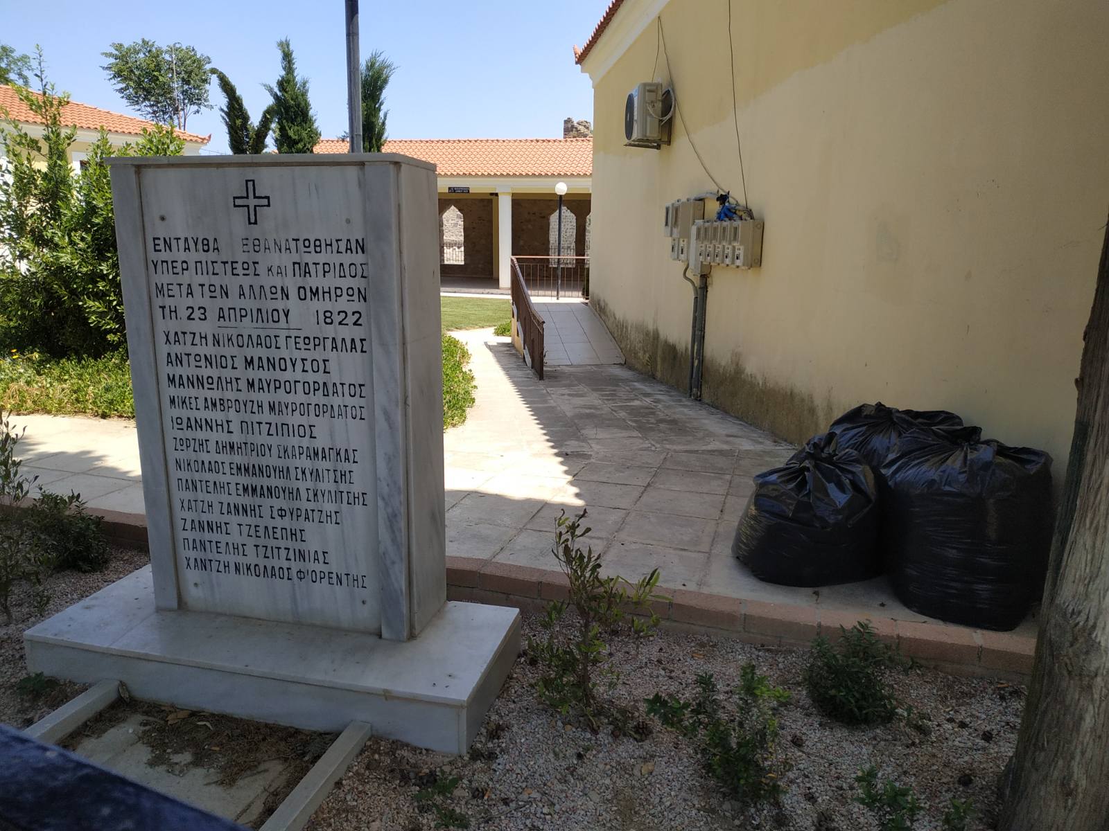 Σε παλαιότερη παρέμβαση μου σε υπάλληλο του δήμου όταν την ίδια μέρα μετά την επιμνημόσυνη δέηση που έγινε,παρατήρησα τα σταθμευμένα μηχανάκια των υπαλλήλων πίσω από το μνημείο, σημειώθηκε προσωρινά όπως φαίνεται αναστολή του φαινομένου της ασέβειας μέχρι σήμερα που γυρίσαμε στα ίδια με τους σάκους απορριμμάτων και το καρότσι της υπηρεσίας καθαριότητας σε πρώτο πλάνο.