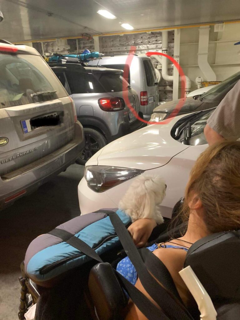 2. Όταν φθάσαμε Πειραιά πριν δέσει το πλοίο μας κατεβάζουν στο γκαράζ που ειναι εντελώς αδύνατο να προσεγγίσουμε το αυτοκινητο. 15 λεπτά διαμονή στο αποπνικτικό περιβάλλον του γκαράζ με τα καυσαέρια, ακομη και για υγιείς ανθρωπους. Διαμαρτύρομαι, την πάνε λιγο πιο πέρα. Κατεβαίνουν οι οδηγοί και περνάνε στην κυριολεξία απο πάνω της. Και να μην έχεις κορωνοιο κινδυνεύεις να κολλήσεις. Δεν φοράει μάσκα η Μυρτω λόγω αναπνευστικού προβλήματος.