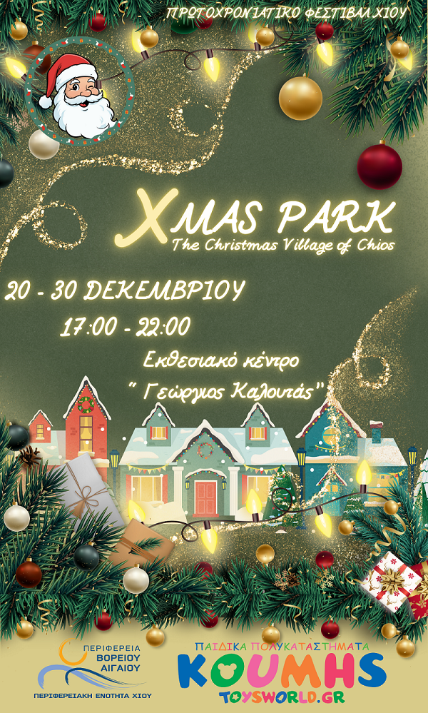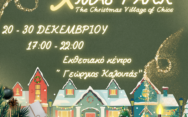 Επίσημη έναρξη του Χριστουγεννιάτικου Πάρκου, το Σάββατο 20 Δεκεμβρίου 2025 και ώρα 18:00, στο εκθεσιακό κέντρο “Γεώργιος Καλουτάς” από την Περιφέρεια Βορείου Αιγαίου. Κέφι, διασκέδαση για μικρούς και μεγάλους κάθε απόγευμα στο Χιώτικο Χριστουγεννιάτικο χωριό.