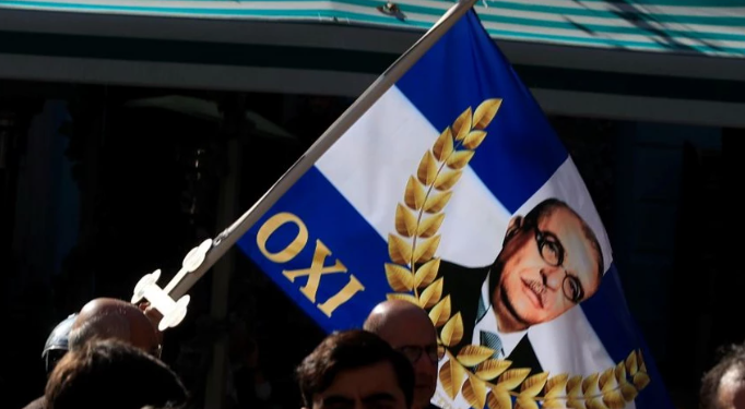 Ένας άνδρας εμφανίστηκε έξω από τη Μητρόπολη κρατώντας σημαίες με το όνομα του πρώην δικτάτορα Ιωάννη Μεταξά, οι οποίες έφεραν τη λέξη «ΟΧΙ», παραπέμποντας στο ιστορικό σύνθημα της 28ης Οκτωβρίου 1940.