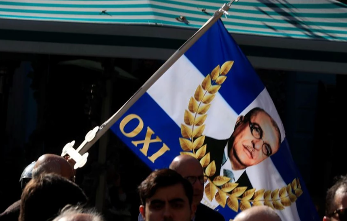 Ένας άνδρας εμφανίστηκε έξω από τη Μητρόπολη κρατώντας σημαίες με το όνομα του πρώην δικτάτορα Ιωάννη Μεταξά, οι οποίες έφεραν τη λέξη «ΟΧΙ», παραπέμποντας στο ιστορικό σύνθημα της 28ης Οκτωβρίου 1940.
