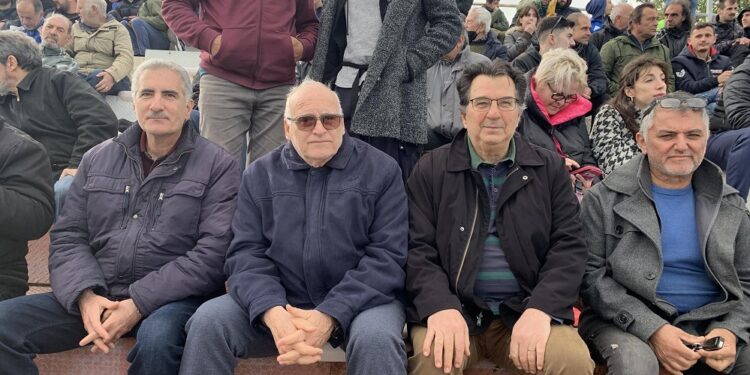‘Αντίπαλοι’ για 90 λεπτά στις κερκίδες του Ενωσιακού γήπεδού της Καλλιμασιάς ο Αντιπεριφερειάρχης Χίου και Καλλιμασιώτης Παντελής Βρουλής και ο γνωστός Αγιοργούσης Αντιπεριφερειάρχης με αρμοδιότητα την απασχόληση και το εμπόριο της Περιφέρειας Β. Αιγαίου, τους φυσικούς πόρους, την προώθηση προϊόντων, τις μεταφορές και τις σχολικές μεταφορές ΠΕ Χίου. Στην φωτογραφία με τον Πρόεδρο του Δαφνώνα Παντελή Μισιριώτη και τον Πρόεδρο του Ολυμπιακού Χίου Μανώλη Αγγουλέ.