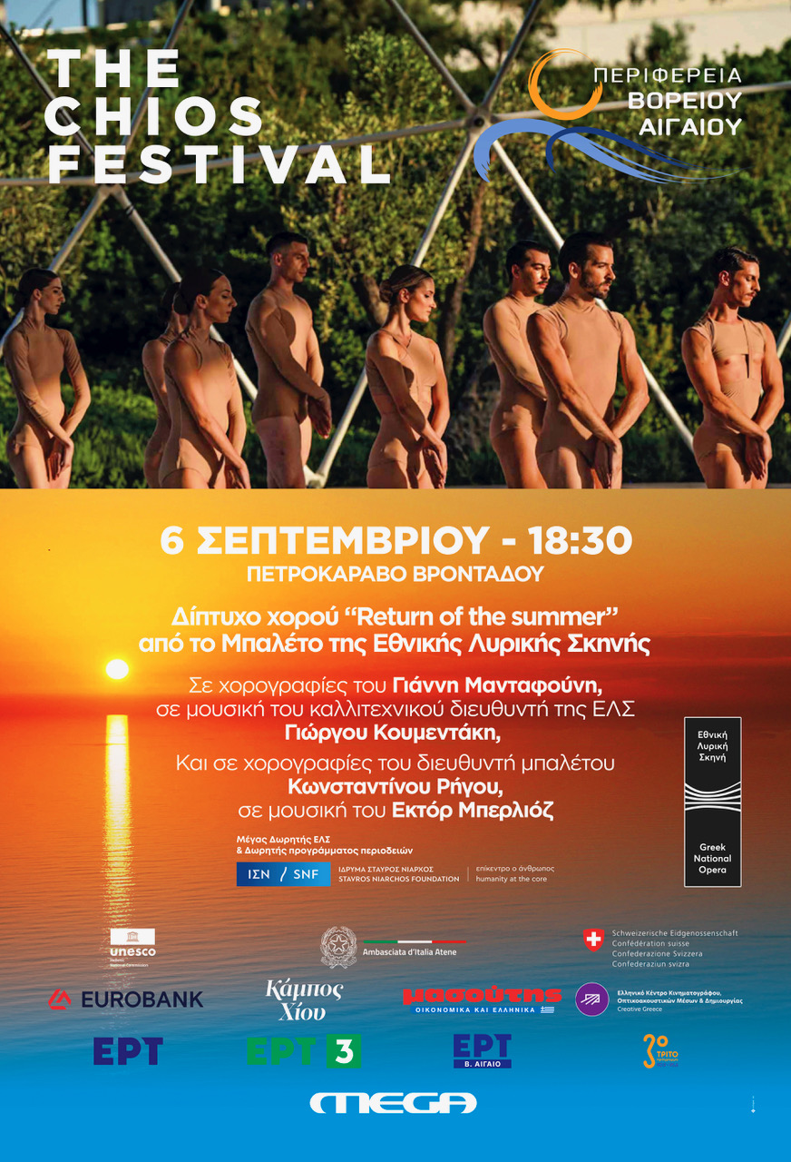 Το κοινό θα απολαύσει το δίπτυχο χορού «Return of the Summer» από το Μπαλέτο της Εθνικής Λυρικής Σκηνής, σε μια μοναδική καλλιτεχνική εμπειρία κάτω από τον ουρανό του Αιγαίου.