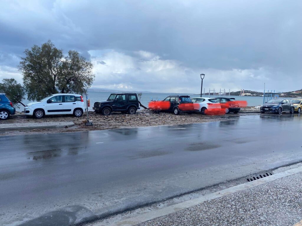 Αυτή είναι η εικόνα από την παραλιακή οδό στο ύψος του αεροδρομίου. Οι πέτρες έχουν βγει στην στεριά και δίπλα στα σταθμευμένα ΙΧ.
