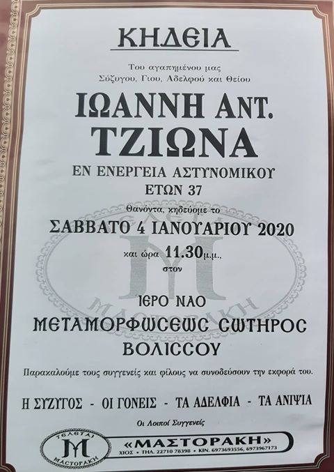 Μετά από άνιση μάχη “έφυγε” από τη ζωή – σε ηλικία 37 ετών – ο εν ενεργεία Αστυνομικός Ιωάννης Τζιώνας, ο οποίος υπηρετούσε στη Βολισσό Χίο και είναι παντρεμένος με Χιώτισσα.