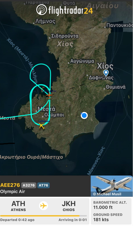 Με καθυστέρηση πραγματοποιήθηκε η βραδυνή πτήση από και προς την Αθήνα από το Αεροδρόμιο της Χίου λόγω προβληματος στον φωτισμό του διαδρόμου προσγειώσεως και στην ηλεκτροδότηση. Οπως βλέπετε στο flight radar η πτήση της Aegean Αθήνα Χίο έκανε κύκλους μέχρι την αποκατάσταση του φωτισμού.