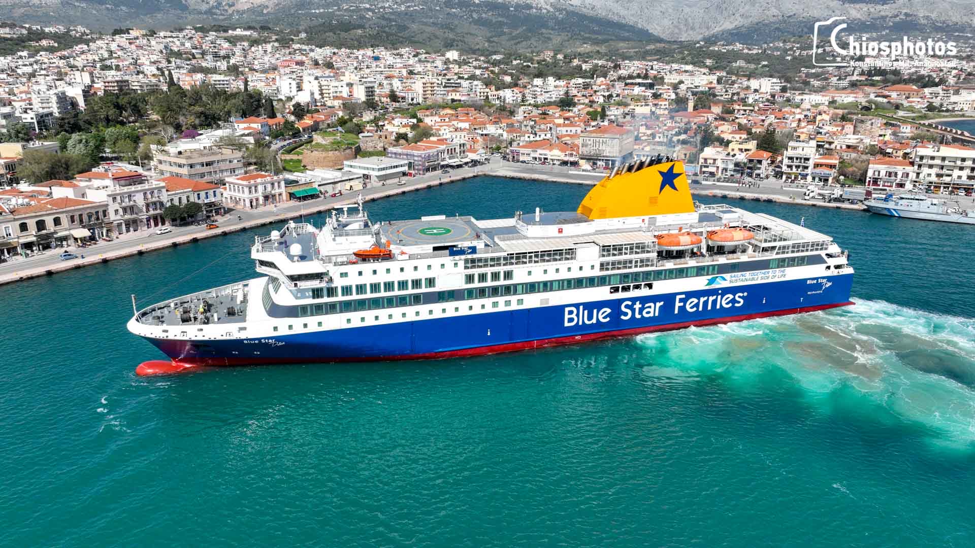 Το Blue Star Delos μπήκε στο λιμάνι της Χίου και με μία δεξιοτεχνική αριστερόστροφη μανούβρα και ένα γρήγορο ρεμέτζο 3 λεπτών έδεσε με ακρίβεια στο λιμάνι. Αυτό ήταν το τελευταίο ταξίδι του Blue Star Delos στην άγονη γραμμή του βορειανατολικού Αιγαίου όπου αντικατέστησε το Blue Star Myconos για 1,5 μήνα περίπου στην ετήσια ακινησία του. Ήταν η πρώτη φορά που δρομολογήθηκε το Blue Star Delos στη γραμμή του Βορειοανατολικού Αιγαίου.