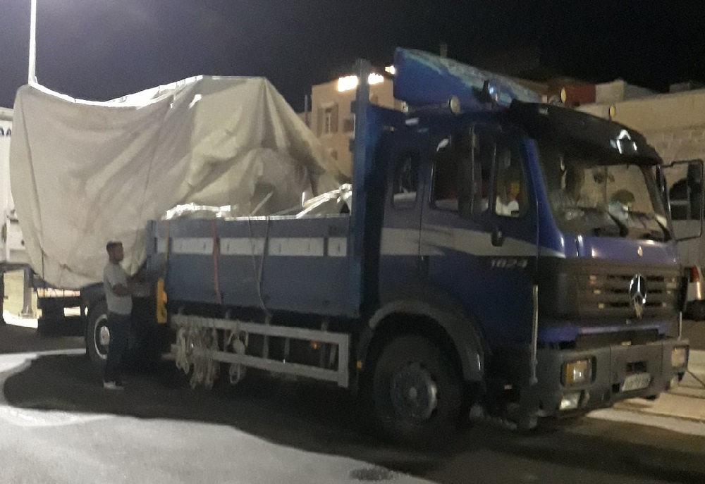 Ξαφνικά ήρθε και στάθμευσε ακριβώς δίπλα μου, με τη καθοδήγηση του λιμενικού, το φορτηγό της φωτογραφίας, που επάνω του είχε ένα φορτίο, του οποίου το ύφος ήταν μεγαλύτερο από τη μεγαλύτερη πλευρά βάσης του φορτηγού. Συγχρόνως με την εμπειρία που έχω υπολόγισα ότι το βάρος του μεταφερόμενο φορτίου είναι της τάξης αρκετών τόνων.