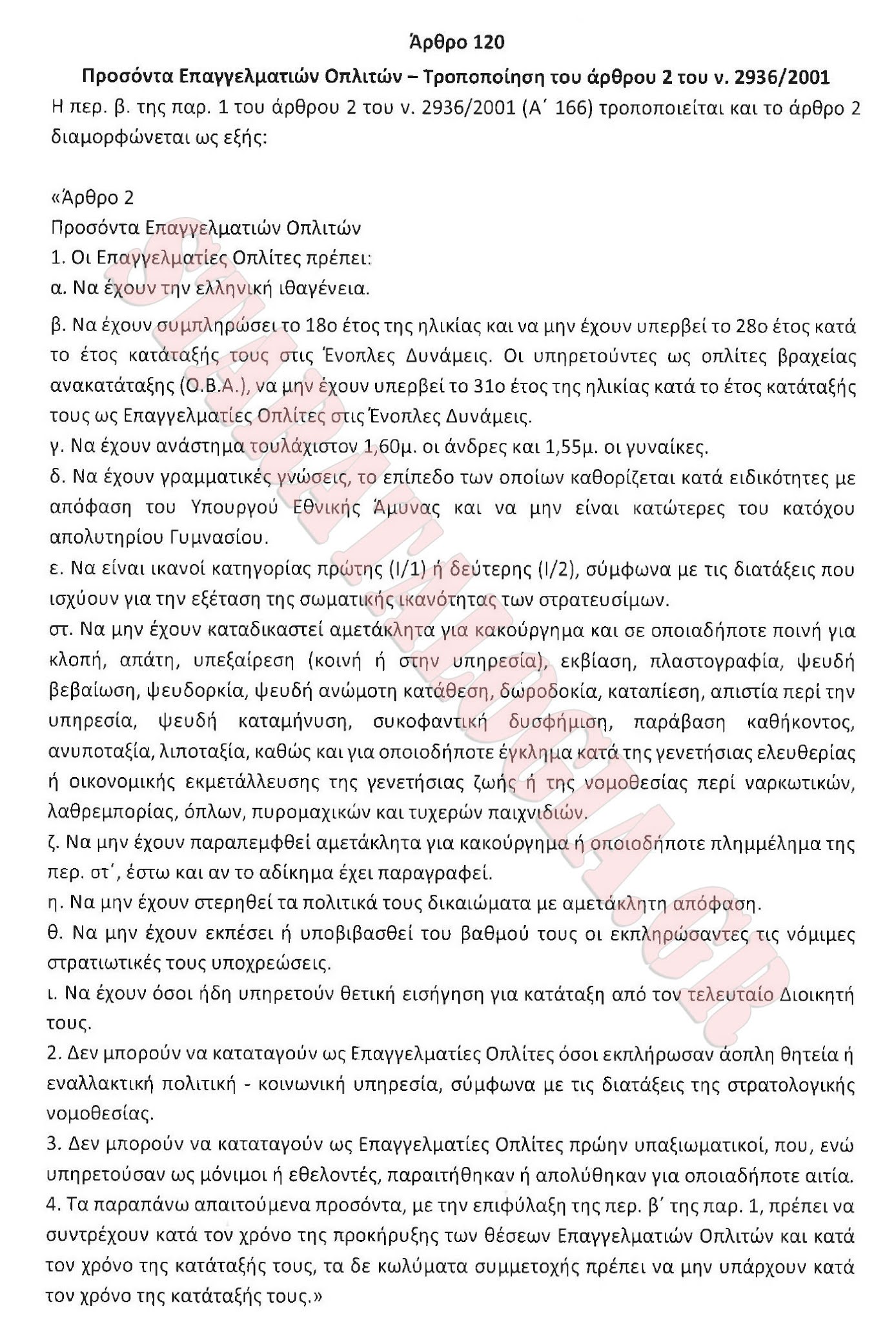 Προσόντα Επαγγελματιών Οπλιτών – Τροποποίηση του άρθρου 2 του ν. 2936/2001