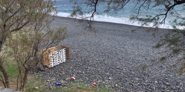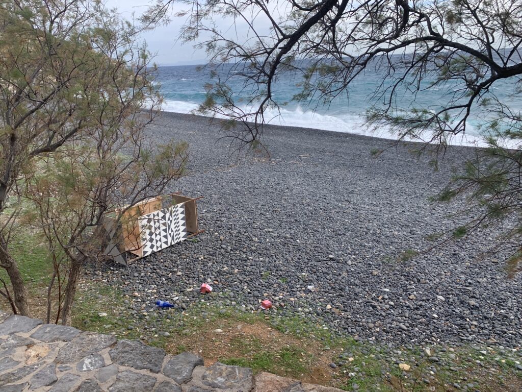 Στην παραλία Μαύρα Βόλια οι γραφικές αλαξιερες με τα Πυργούσικα ξυστά βγήκαν από τις θέσεις τους λόγω του δυνατού αέρα. Η φουρτουνιασμένη θάλασσα σε Κώμη και Εμπορειός βγήκε στην στεριά για ακόμα μια φορά.