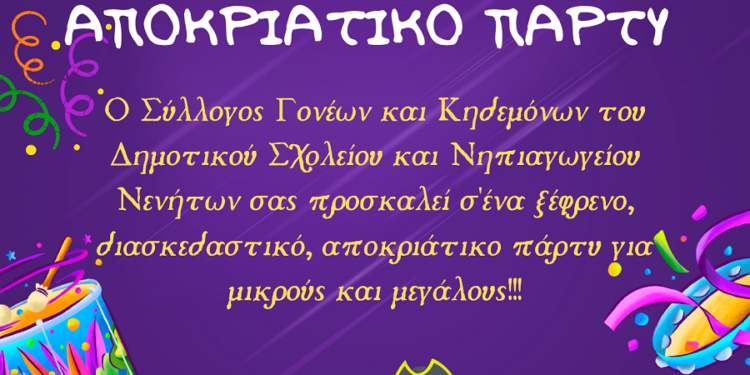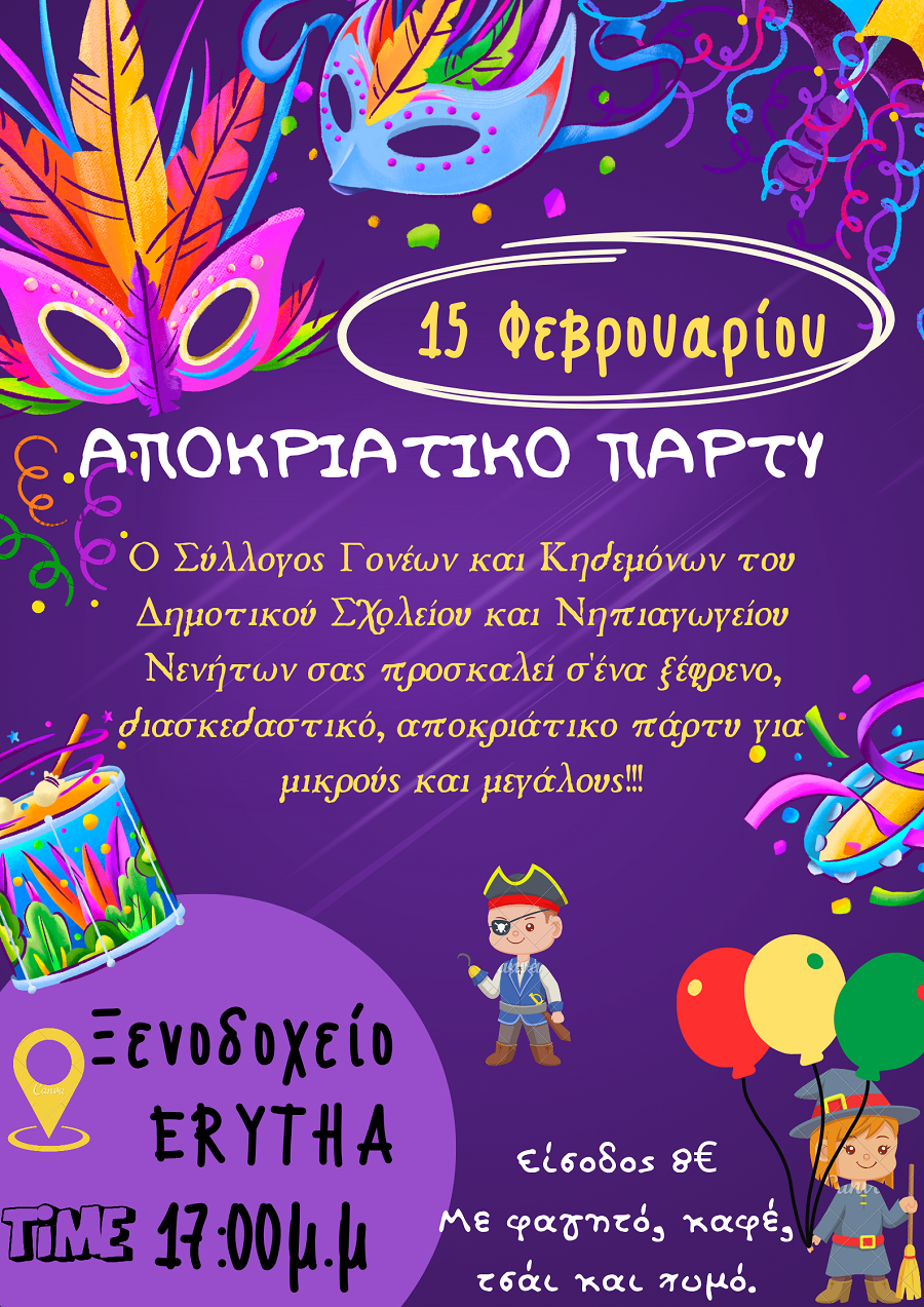 Ο Σύλλογος Γονέων και Κηδεμόνων του Δημοτικού Σχολείου και Νηπιαγωγείου Νενήτων προσκαλεί σε ένα ξέφρενο, διασκεδαστικό αποκριάτικο πάρτυ για μικρούς και μεγάλους, το Σάββατο 15 Φεβρουαρίου στις 17:00 στο Ξενοδοχείο «Erytha».
