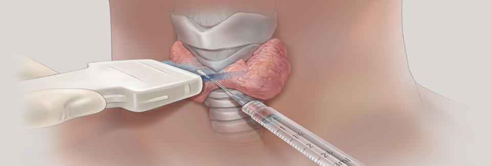 7. Με την παρακέντηση είτε ενός όζου είτε ενός διογκωμένου τραχηλικού λεμφαδένα (η FNA αποτελεί το σημαντικότερο εργαλείο για τη διάγνωση των κακοήθων παθήσεων και πρέπει να διενεργείται για κάθε όζο μεγαλύτερο του 1 εκατοστού είτε για κάθε όζο ανεξαρτήτως μεγέθους αλλά με ύποπτα απεικονιστικά χαρακτηριστικά ή οικογενειακό ιστορικό θυρεοειδικής κακοήθειας). Η κυτταρολογική εξέταση, για την οποία υπάρχει πλέον μεγάλη εμπειρία, βοηθάει να ξεχωρίσουμε τους όζους εκείνους που υποκρύπτουν κακοήθεια και πρέπει ως εκ τούτου να χειρουργηθούν. Με τις μεθόδους μοριακής βιολογίας, βρίσκουμε νέους μοριακούς δείκτες που βοηθούν στην ακριβέστερη κατηγοριοποίηση του όγκου και τον καθορισμό της πρόγνωσης.