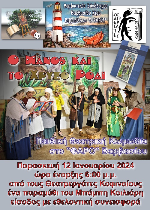 Την Παρασκευή 12 Ιανουαρίου 24 οι Θεατρεργάτες Κοφιναίοι θα παίξουν την παιδική ξεκαρδιστική κωμωδία “Ο Μάνος και το Χρυσό Ρόδι” στο Φάρο Φαρβασίου. Πρόκειται για μια παιδική θεατρική παράσταση για όλες τις ηλικίες. Ώρα έναρξης 6.00 το απόγευμα. Το παραμύθι αυτό γράφτηκε από τον Μπάμπη Κοιλιάρη αρχικά ως θεατρικό αλλά συμπεριλαμβάνεται και στο πρόσφατο βιβλίο παραμυθιών του συγγραφέα “18+1 μολύβια γράφουν παραμύθια” που θα μπορείτε να προμηθευτείτε και από την παράσταση.