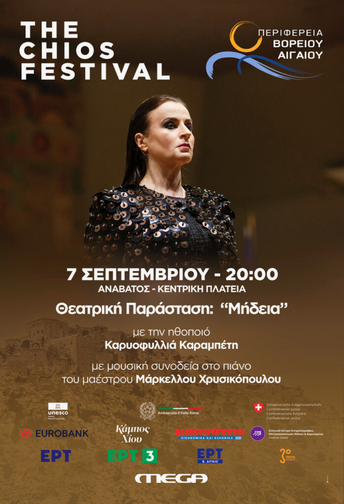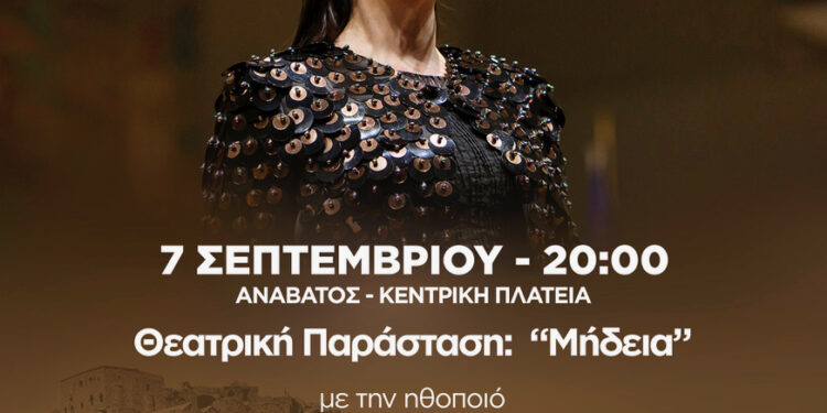 - 20:00 – Ανάβατος, Κεντρική Πλατεία: Θεατρική παράσταση «Μήδεια» με την κορυφαία ηθοποιό Καρυοφυλλιά Καραμπέτη και τονμαέστρο Μάρκελλο Χρυσικόπουλο