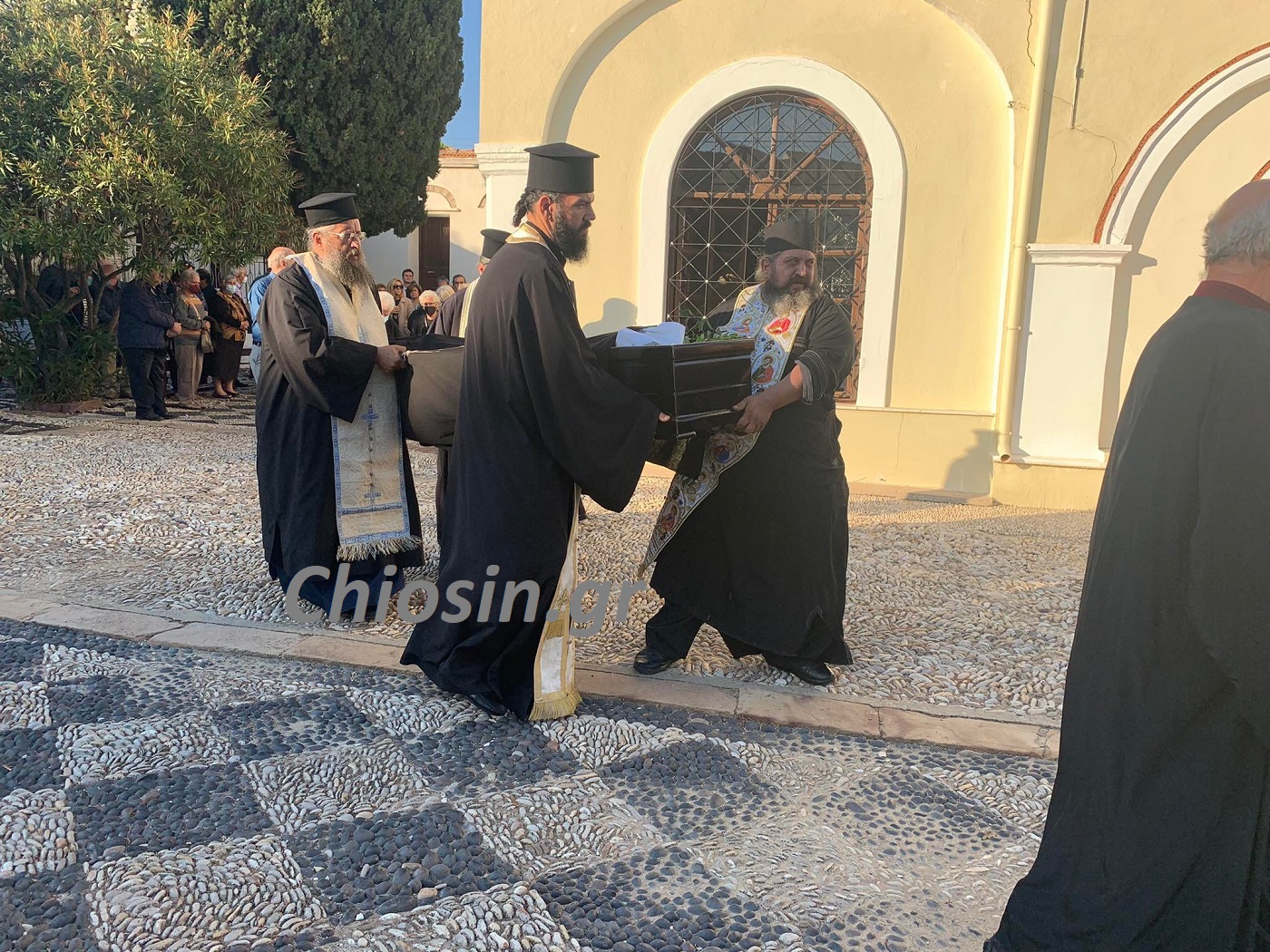 Από τις οκτώ το πρωί της Τρίτης το σεπτό της σκήνωμα είχε τοποθετηθεί στο μέσο του Ιερού Ναού του Αγίου Μηνά για προσκύνηση από τους πιστούς ενώ στεφάνι απέστειλε ο Αρχηγός της Εθνικής Φρουράς και πρώην στρατιωτικός διοικητής Χίου Αντιστράτηγος Δημόκριτος Ζερβάκης.