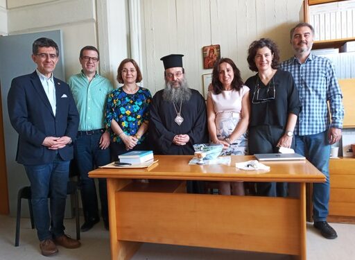 Τόν Φιλόλογο Ἱεράρχη ὑπεδέχθησαν οἱ Καθηγητές κ. Σοφία Γεωργακοπούλου (Κλασσική Φιλολογία), κ. Βασίλειος Βερτουδάκης (Κλασσική Φιλολογία), κ. Γεώργιος Κούζας (Λαογραφία), κ. Γεώργιος Πιτσινέλλης (Βυζαντινή Φιλολογία) καί ἡ Διδάκτωρ Παπυρολογίας κ. Ἑλένη Τσιτσιανοπούλου. Μετά τήν τέλεση τοῦ ἁγιασμοῦ ὁ Σεβ. Χίου εἶχε πολύωρη φιλολογική συζήτηση μέ τούς ὡς ἄνω Ἐπιστήμονες, οἱ ὁποῖοι ἐδώρισαν μεγάλη σειρά φιλολογικῶν βιβλίων γιά τήν Βιβλιοθήκη ΑΓ. ΑΓΑΠΗΤΟΣ.