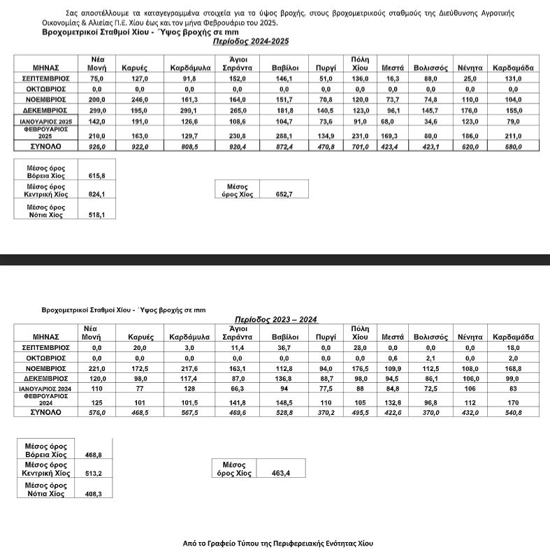 ΑΠΟΣΤΟΛΗ ΒΡΟΧΟΜΕΤΡΙΚΩΝ ΣΤΟΙΧΕΙΩΝ ΦΕΒΡΟΥΑΡΙΟΥ 2025 Από το Γραφείο Τύπου της Περιφερειακής Ενότητας Χίου