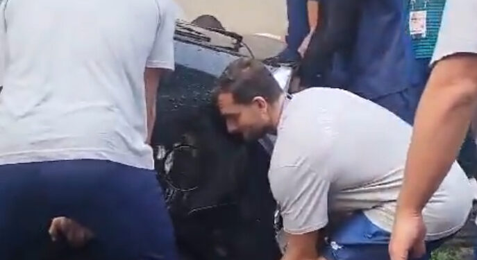 Η ελληνική ομάδα υδατοσφαίρισης σηκώνει ένα σταθμευμένο αυτοκίνητο που εμποδίζει το λεωφορείο της Ολυμπιακής ομαδασ να περάσει σε ένα στενό δρόμο.