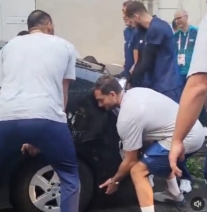 #Paris2024 L'équipe de water polo grecque soulève une voiture garée qui empêche son bus olympique de passer dans une rue étroite. pic.twitter.com/JGu2ys2v3w