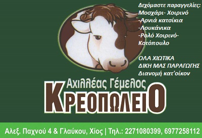 Το κρεοπωλείο Αχιλλέας Γέμελος σας εύχεται καλές γιορτές και σας ενημερώνει ότι στην οδό Αλεξ. Παχνού 4 & Γλαύκου. Ένα κρεοπωλείο το οποίο από την έναρξη του έως σήμερα κατακτά τις καρδιές του καταναλωτικού κοινού της Χίου. Το Κρεοπωλείο Αχιλλέας Γέμελος διαθέτει μια μεγάλη ποικιλία παραδοσιακών προϊόντων κρέατος: