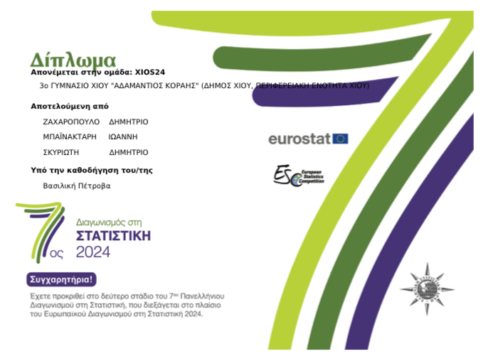 Οι μαθητές του 3ου Γυμνασίου Χίου κατά την φετινή σχολική χρονιά 2023-2024 συμμετείχαν στον 7ο διαγωνισμό Στατιστικής και διακρίθηκαν στην 4η θέση από τις 5 που βραβεύτηκαν. Οι μαθητές ασχολήθηκαν με την μελέτη των εισαγωγών και των εξαγωγών της Ελλάδας από και προς τα κράτη της Ευρωπαϊκής Ένωσης και της Τρίτες Χώρες,  με τη μελέτη των εισαγωγών και εξαγωγών ανά ομάδα αγαθών και τη μελέτη των τριών μεγαλύτερων σε αξία εισαγωγών και εξαγωγών ομάδων αγαθών και ο προσδιορισμός των μηνών κατά τους οποίους εντοπίζεται η μεγαλύτερη και η μικρότερη αξία.
