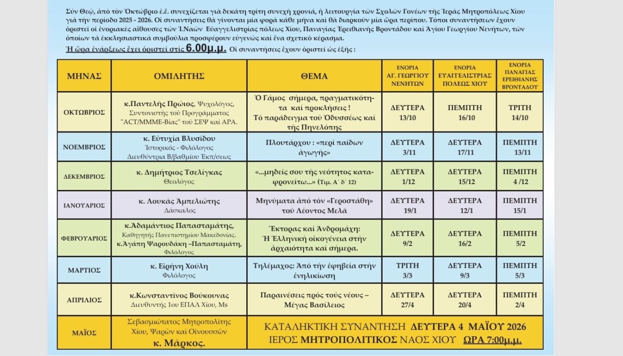 Γνωστό έγινε το πρόγραμμα της Σχολής Γονέων της Ιεράς Μητρόπολης Χίου.