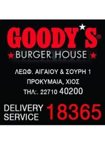 Το Goody’s Burger House (Chios) συνεχίζει την λειτουργία του με την υπηρεσία take-away ώστε να εξυπηρετήσει όσους μετακινούνται αναγκαστικά για να πάνε στη δουλειά τους και με Delivery – Διανομή κατ΄ οίκον. Οι υπόλοιποι #menoumespiti και κάνουμε την παραγγελία μας από το goodysdelivery.gr.