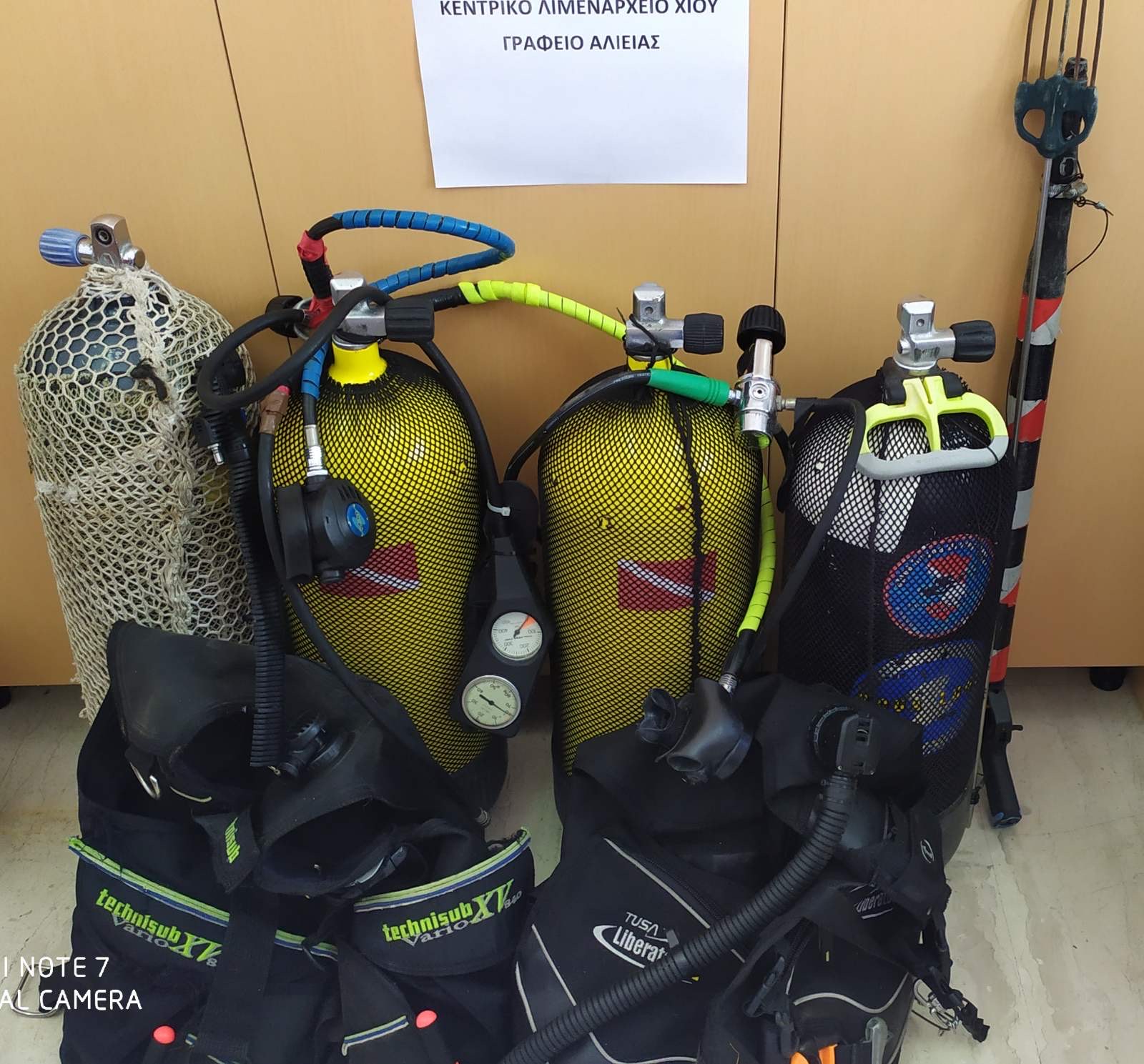 Το Κεντρικό Λιμεναρχείο Χίου ενημερώνει ότι, στα πλαίσια των συστηματικών ελέγχων για την πάταξη της παράνομης αλιείας που διενεργήθηκαν την 22/07/2020 στη περιοχή «Γρίδια» Χίου από μικτό κλιμάκιο στελεχών της Υπηρεσίας μας και Κ.Ε.Α. Υπηρεσίας μας, σε γενόμενο έλεγχο εντοπίστηκαν δύο (02) άτομα να διενεργούν υποβρύχια αλιεία με την χρήση καταδυτικών συσκευών κατά τη διάρκεια της νύκτας κατά παράβαση του Άρθρου 3 του Π.Δ. 373/1985. Από Υπηρεσία μας κατασχέθηκαν τέσσερις (04) φιάλες κατάδυσης οξυγόνου, δύο (02) ρυθμιστές πνευστότητας, δύο (02) γιλέκα με ρυθμιστή πνευστότητας καθώς και ένα (01) ψαροντούφεκο. Παράλληλα κινήθηκε η διαδικασία επιβολής διοικητικών κυρώσεων στους ανωτέρω.