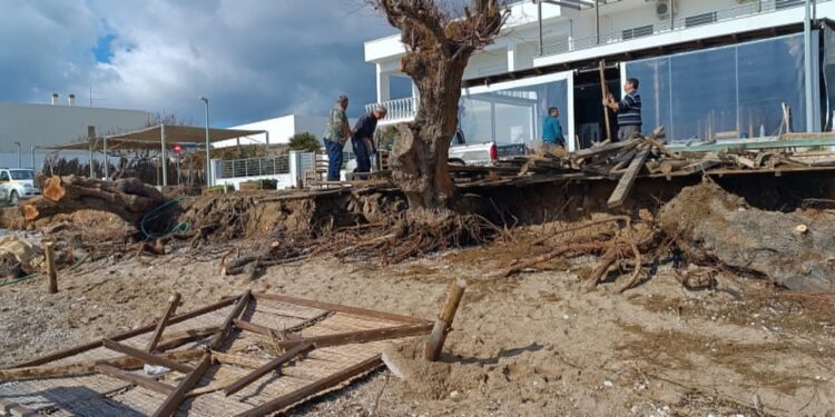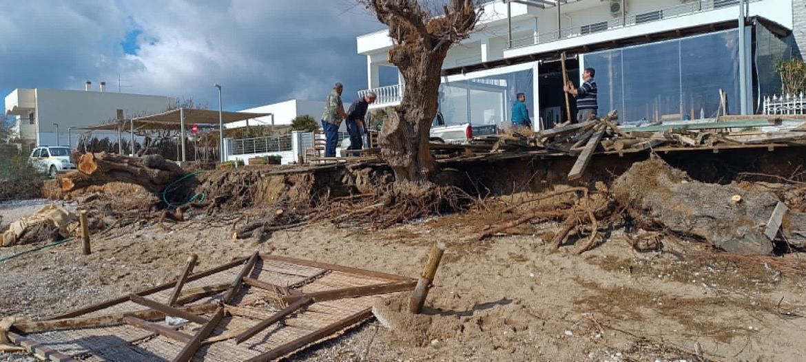 Στη δυτική Κώμη ανοίξαμε δίοδο να διαφύγει ο τεράστιος όγκος των εγκλωβισμένων ομβρίων υδάτων, και τέλος καθαρίστηκε για δεύτερη φορά ο πεζόδρομος στο κέντρο, από την άμμο και τα βότσαλα που ανέβασαν οι Νότιοι άνεμοι.