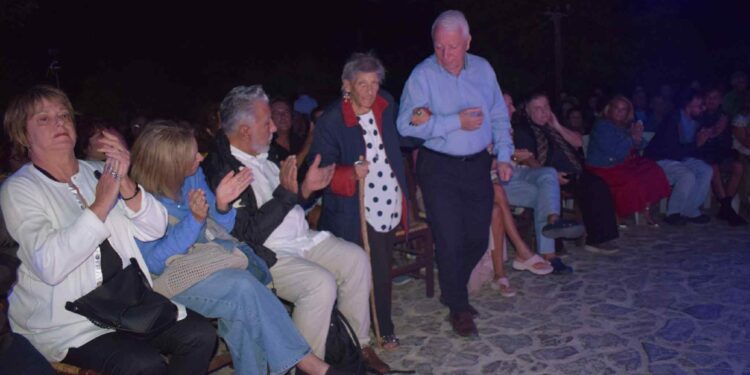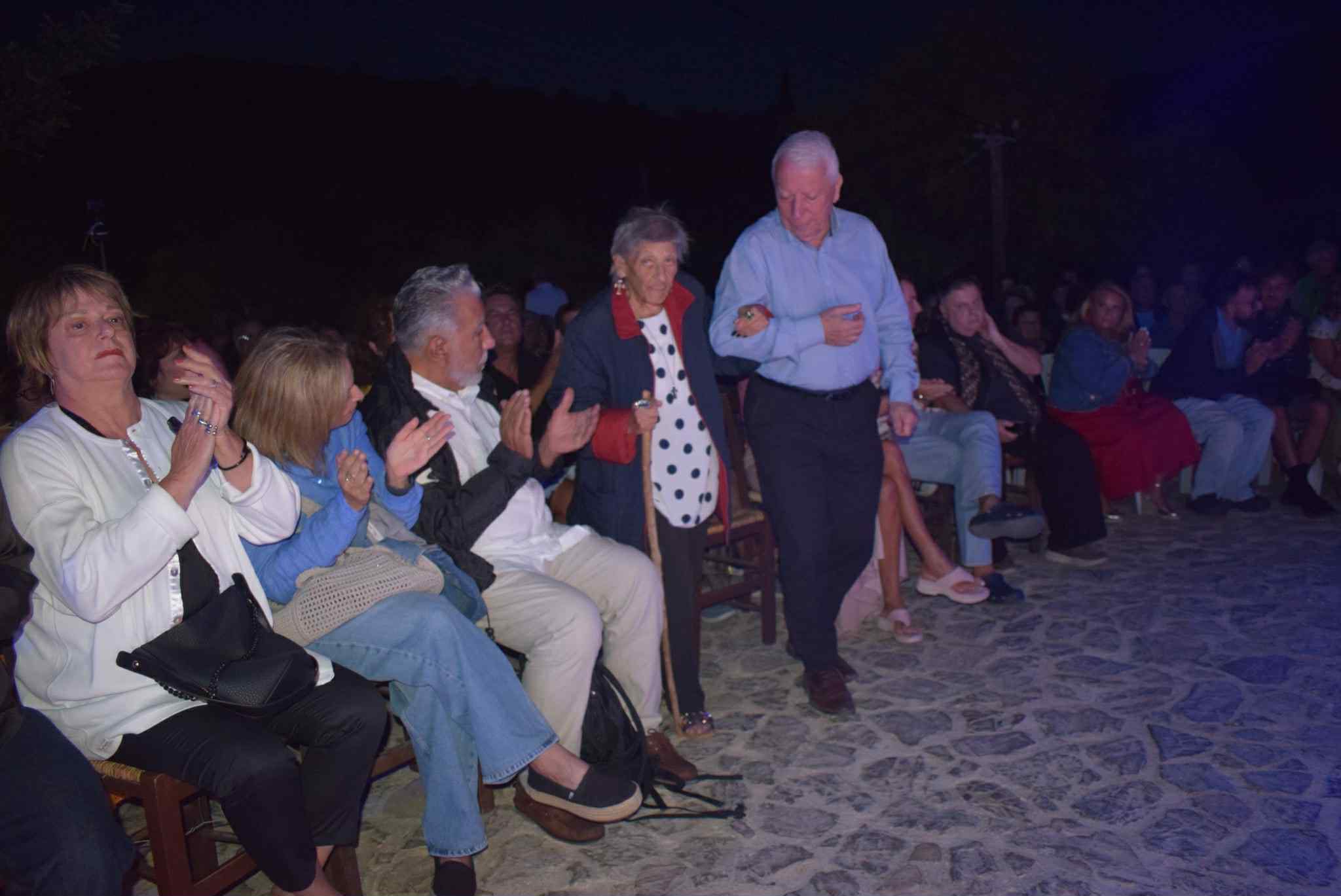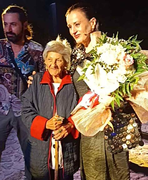 Η μοναδική κάτοικος του ερειπωμένου Ανάβατου δίνει ανθοδέσμη στην Καρυοφυλλιά Καραμπέτη μετά το πέρας της παράστασης Μήδεια στα πλαίσια του 4ου φεστιβάλ Χίου που διοργανώνει η Περιφέρεια Β. Αιγαίου.