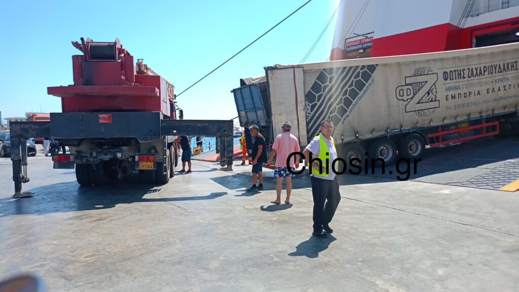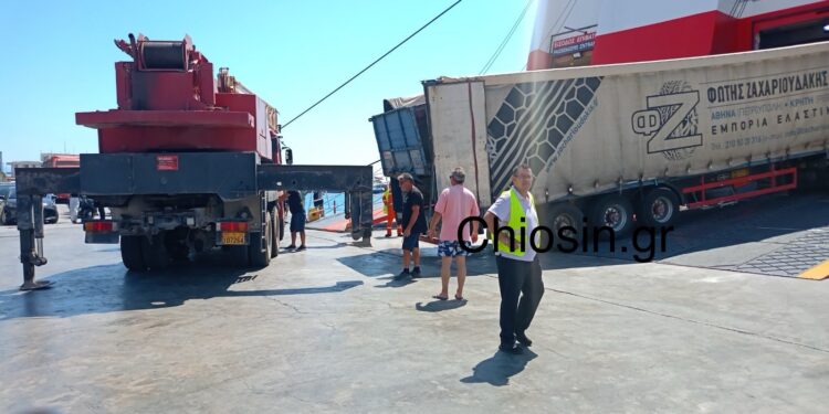 Με γερανό σηκώθηκε η νταλίκα για να σηκωθεί το υπερμεγέθες όχημα και το πλοίο συνέχισε το δρομολόγιο του από τη Χίο για τονΠειραιά.