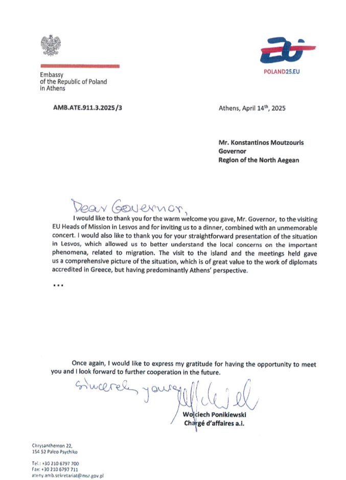 Στην ευχαριστήρια επιστολή ο Πολωνός Πρέσβης αναφέρει μεταξύ άλλων πως η επίσκεψη των Πρέσβεων στην Μυτιλήνη και τα όσα ο Περιφερειάρχης ανέφερε στην ομιλία του προς αυτούς, ήταν μια εξαιρετική ευκαιρία για να διαπιστώσουν από κοντά την κατάσταση που επικρατεί στο νησί, τον τρόπο που οι νησιώτες αντιμετωπίζουν τις καταστάσεις σε σχέση με το μεταναστευτικό ζήτημα και να διαμορφώσουν άποψη επί των πραγματικών γεγονότων.