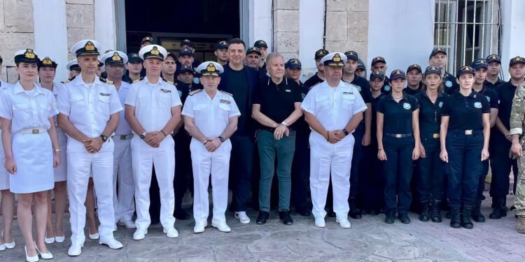 Έπειτα, ο Υπουργός μετέβη για επιθεώρηση στα περιπολικά σκάφη του Λ.Σ-ΕΛ.ΑΚΤ. που ελλιμενίζονται στο λιμένα Βαθύ και συνεχάρη τα πληρώματα για τη διαρκή ετοιμότητα, τον επαγγελματισμό και την προσήλωσή τους στο καθήκον, με γνώμονα την προστασία της ανθρώπινης ζωής στη θάλασσα και την προάσπιση των θαλασσίων συνόρων της πατρίδας.