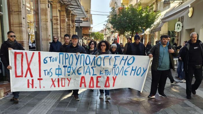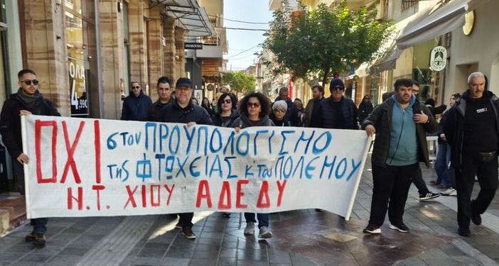 «Όχι στον προϋπολογισμό της φτώχειας και του πολέμου» έγραφε το πανό του ΝΤ Χίου της ΑΔΕΔΥ, στη διάρκεια της κινητοποίησης.