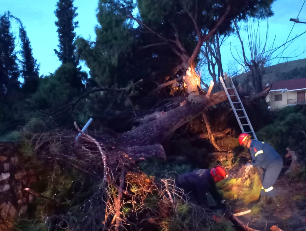 Από τις 05:00 το πρωί, υπάλληλοι της Υπηρεσίας Καθαριότητας του Δήμου, σε συνεργασία με την Πυροσβεστική Υπηρεσία, προχωρούν στην απομάκρυνση του δέντρου και τον καθαρισμό του οδοστρώματος.