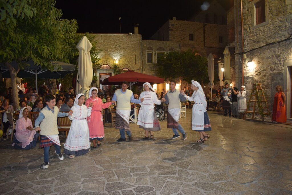 Η βραδιά περιλάμβανε μεσαιωνικό παζάρι στα Μεστά με ντόπια προϊόντα και εκδήλωση χιώτικης γαστρονομίας με Χιώτισσες μαγείρισσες και την Αργυρώ Μπαρμπαρίγου και στη συνέχεια γλέντι στην πλατεία την Κυριακή το βράδυ.