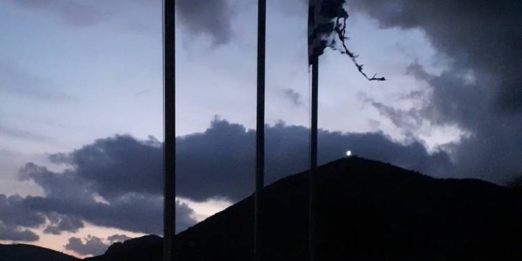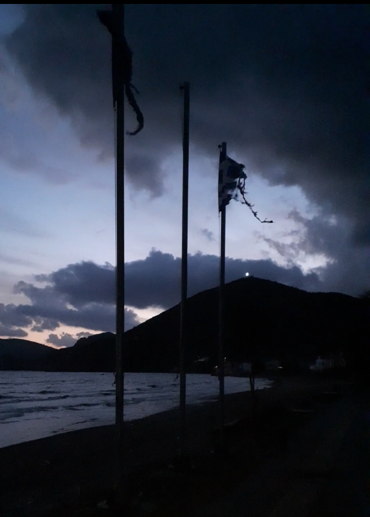 Κουρελιασμένες και μάλιστα η μια λείπει οι σημαίες στην Κώμη. Η Ελληνική σημαία και της ΕΕ είναι σκισμένες ενώ λείπει η μπλε σημαία.