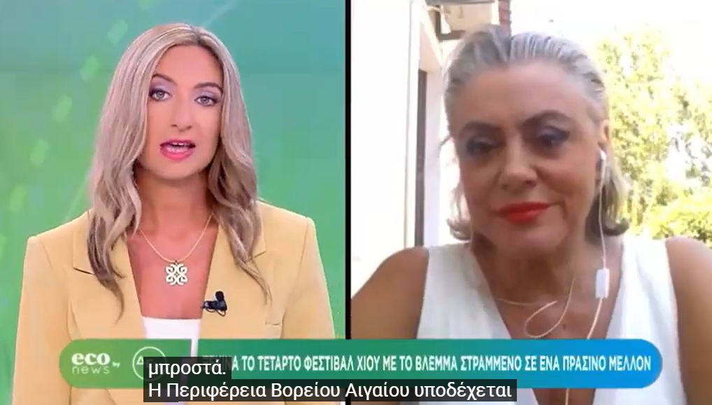 Χτες η Δήμητρα Μουτζούρη μίλησε στην εκπομπή ECO NEWS BY ΔΕΗ του ΣΚΑΙ και την Κορινα Γεωργίου για το 4ο Φεστιβάλ Χίου, το φετινό πρόγραμμά του και την σημασία που δίνεται σε ένα πράσινο μέλλον με αφορμή τις δράσεις του.