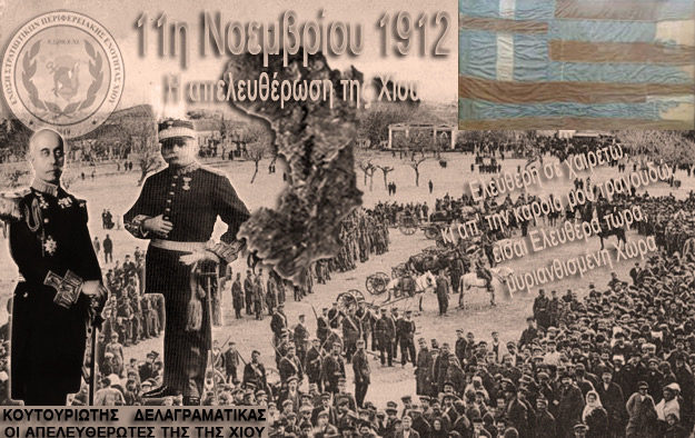 Η Ελληνική όμως Ιστορία είναι γεμάτη από αγώνες για την απόκτηση ή ανάκτηση ενός πολύτιμου αγαθού για τον άνθρωπο, της Ελευθερίας, για το οποίο θυσιάζει ακόμη και την ίδια του τη ζωή. Αυτό το γνωρίζουν καλά οι Χιώτες, που πλήρωσαν με το αίμα τους την αγάπη τους για τη Λευτεριά το 1822, όταν οι Τούρκοι κατέστρεψαν ολοκληρωτικά το νησί και έσφαξαν τους κατοίκους του. 90 χρόνια αργότερα ήρθε το πλήρωμα του χρόνου και οι Χιώτες αναπνέουν ελεύθεροι. Ήταν η 11η Νοεμβρίου του 1912, οταν ο ελληνικός στόλος (3 καταδρομικά «Μακεδονία», «Εσπερία», «Αρκαδία», δύο αντιτορπιλικά «Νέα Γενεά», «Κεραυνός» και 3 μεταγωγικά «Πατρίς», «Σαπφώ», «Εριέττα» με 2500 στρατιώτες) φτάνει έξω από το λιμάνι της Χίου.
