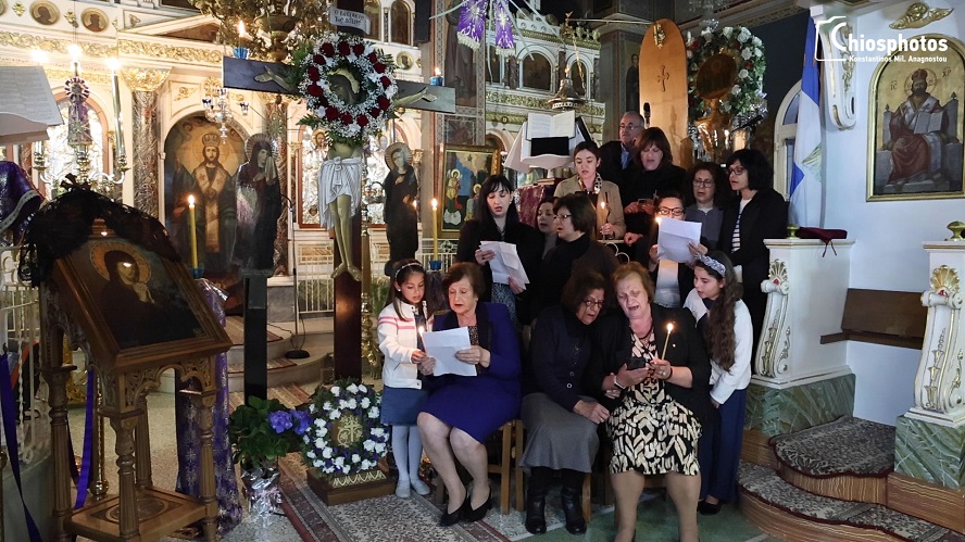 Το ίδιο έθιμο αναβιώνει όμως και στο χωριό Καρυές έξω από την πόλη της Χίου. Κάθε χρόνο οι γυναίκες του χωριού στολίζουν τον επιτάφιο τραγουδώντας το μοιρολόι, όπου οι μεγαλύτερες το μαθαίνουν στις νεότερες διατηρώντας την παράδοση ετών.