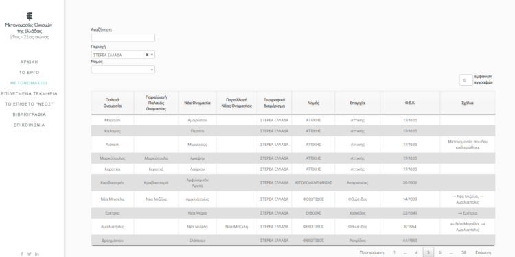 Το Ινστιτούτο Ιστορικών Ερευνών του Εθνικού Ιδρύματος Ερευνών (ΕΙΕ) ολοκλήρωσε την καταγραφή όλων των μετονομασιών των πόλεων και των χωριών της Ελλάδας και δημοσίευσε στο διαδίκτυο τη σχετική ψηφιακή εφαρμογή. Στην ιστοσελίδα του ερευνητικού προγράμματος «Μετονομασίες Οικισμών της Ελλάδας, 19ος – 21ος αιώνας» οι επισκέπτες μπορούν να αναζητήσουν πληροφορίες για το νέο και το παλαιό όνομα 4.981 οικισμών που μετονομάστηκαν, μία ή παραπάνω φορές, με επίσημες διοικητικές πράξεις την περίοδο 1831-2011.