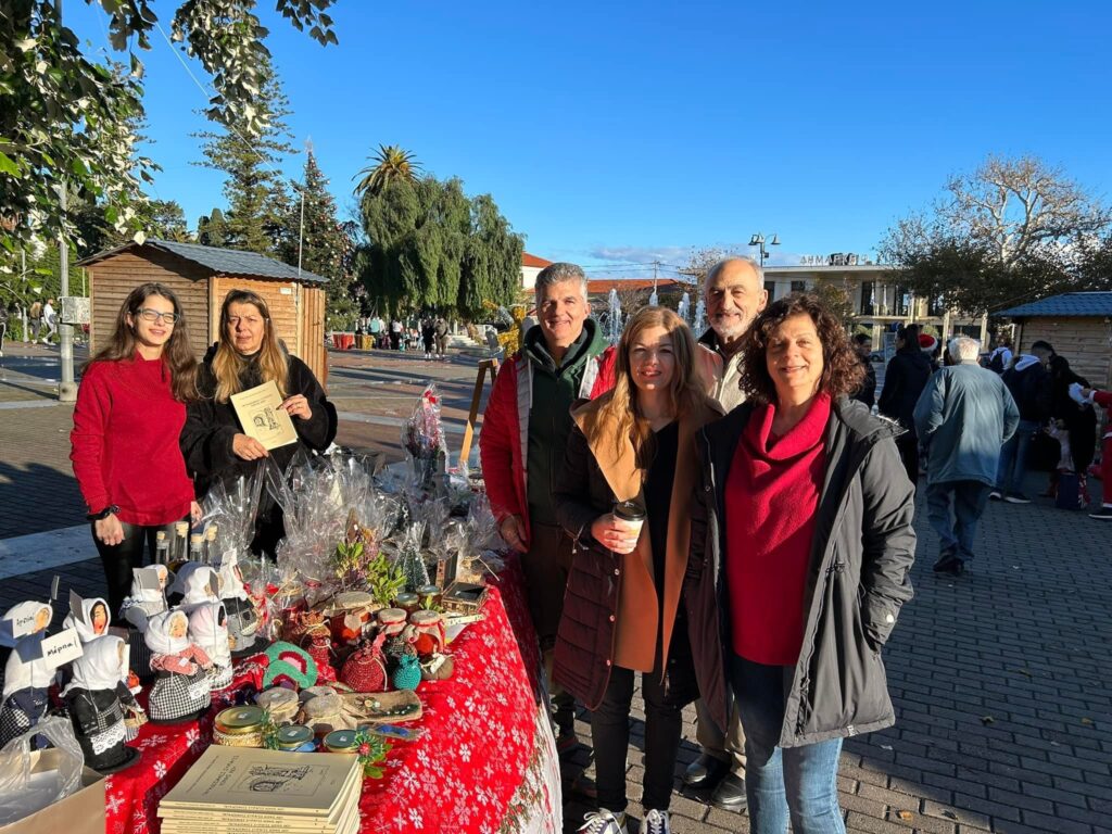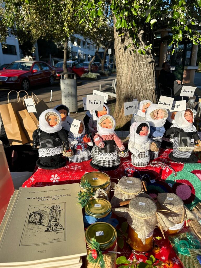 Τα κορίτσια με τα μισοφόρια (μακρυά φούστα εργασίας από τη παραδοσιακή ενδυμασία )είναι έτοιμα για τη πλατεία της Χίου στο bazaar του Πολιτιστικού συλλόγου Κοινής Ερατω , Θαλεια Ωραιανθη Μελπω και πολλές άλλες χωριανές, δια χειρός Mιχαελας Μίκλιας.