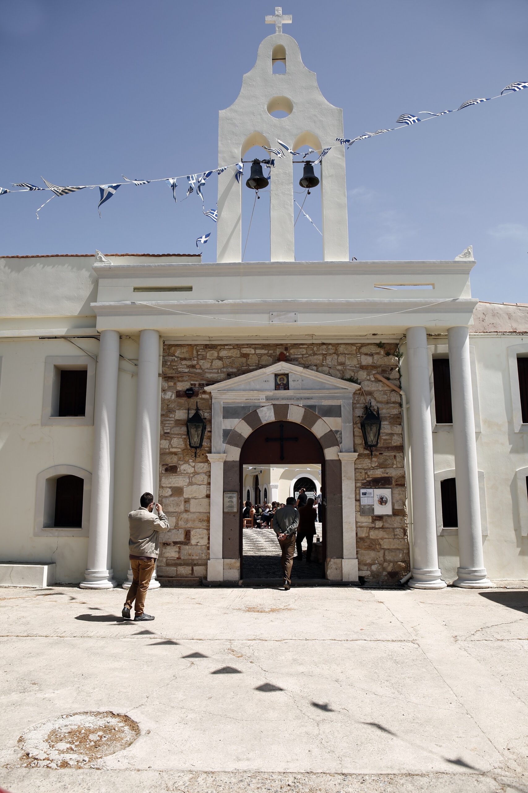 Η ατμόσφαιρα, λοιπόν, είναι βαριά. Mε έναν τρόπο ειρωνικό και εντελώς αντιστικτικό σε σχέση με την ομορφιά του τοπίου, αφού από παντού μπορείς να δεις τη θάλασσα μυρίζοντας το αλάτι και τις τριγύρω τριανταφυλλιές. Η Via Dolorosa διαπερνά κάθε σκηνικό εδώ στη Χίο και συνδέεται με την ομορφιά, με έναν άγριο τρόπο: τα κόκαλα από τη βάρβαρη σφαγή, οι μύθοι πίσω από τις πέτρες, ακόμα και τα οδυνηρά πρόσωπα των Αγίων που βλέπουμε στις εικόνες του ιερού –εντελώς Ναζαρηνών, πριν δηλαδή τους αγίους της βυζαντινής αγιογραφίας– όλα σε συνδέουν άμεσα με τη βαρύτητα της γης.