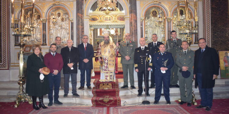 Ο Μητροπολίτης Χίου κκ. Μάρκος έχοντας δίπλα του τις Στρατιωτικές αρχές, τον Αντιπριφερειάρχη Χίου κ. Παντελή Βρουλή, τον Αντιπεριφερειάρχη Παιδείας κ. Στέλιο Καμπούρη, τον Δήμαρχο Χίου κ. Σταμάτη Κάρμαντζη, τον Αντιδήμαρχο τουρισμού κ. Κώστα Βεργίνα και τον Διευθυντή της ΔΔΕ κ. Αιμιλιανό Ευαγγελινό στο μήνυμα του αναφέρθηκε στην ενότητα των Αρχών για το καλό της Χίου πέρα από τα προσωπικά συμφέροντα. Το πάτερ υμών απήγγειλε ο διοικητής της 96 ΑΔΤΕ “Χίος” Κωνσταντίνος Κολοκοτρώνης που από χθες το βράδυ προήχθη στον βαθμό του Υποστράτηγου.