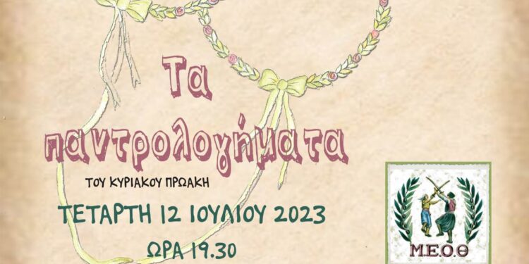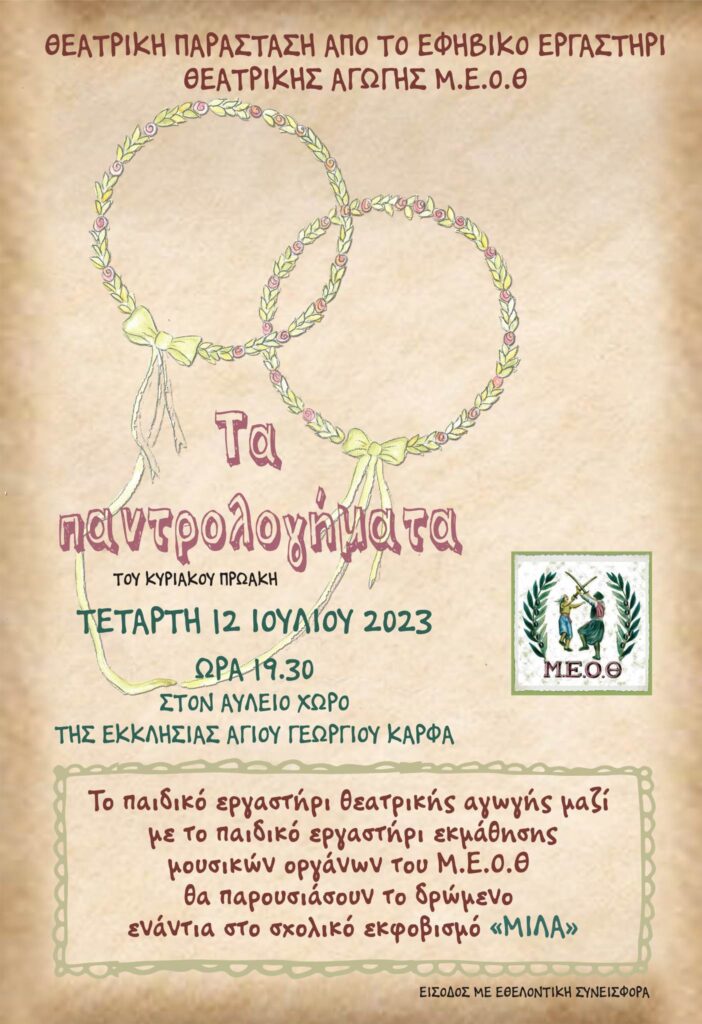 Σας προσκαλούμε στη γιορτή- κλείσιμο της χρονιάς του παιδικού και του εφηβικού θεατρικού εργαστηρίου του ΜΕΟΘ, την Τετάρτη 12 Ιουλίου και ώρα 19:30 μ.μ. στον αύλειο χώρο της εκκλησίας του Αγίου Γεωργίου στον Καρφά.Η παιδική θεατρική ομάδα θα παρουσιάσει το δρώμενο “ΜΙΛΑ” ,ένα δρώμενο ενάντια στον σχολικό εκφοβισμό ,με τη συμμετοχή του παιδικού εργαστηρίου μουσικής του Μ.Ε.ΟΘ ,υπό την επιμέλεια του κ. Γιώργου Αγιάσογλου.Ακολουθεί ένα αφιέρωμα στον δάσκαλο της καρδιάς μας, τον κ. Κυριάκο Πρωάκη, με την διασκευή του παραδοσιακού θεατρικού έργου ” ΤΑ ΠΑΝΤΡΟΛΟΓΗΜΑΤΑ” από τα παιδιά του εφηβικού θεατρικού εργαστηρίου. “Ο Κωστής επαραμεγάλωσενε πια κι ήρτενε η ώρα να αποκατασταθεί, να ανοίξει σπιτικό. Στέλνει προξενιό στην όμορφη Ασημούλα. Και η νύφη, είπενε το ” ναι;”Υπεύθυνες εργαστηρίου: Κατερίνα Κωνσταντά , Μαίρη Σγουρούδη και Βασιλεία Βερβεράκη.