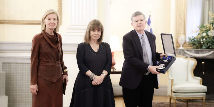 Η Πρόεδρος της Δημοκρατίας Κατερίνα Σακελλαροπούλου, σε τελετή που πραγματοποιήθηκε στο Προεδρικό Μέγαρο, απένειμε το παράσημο του Μεγαλόσταυρου του Τάγματος της Τιμής στον εφοπλιστή Αθανάσιο Μαρτίνο.